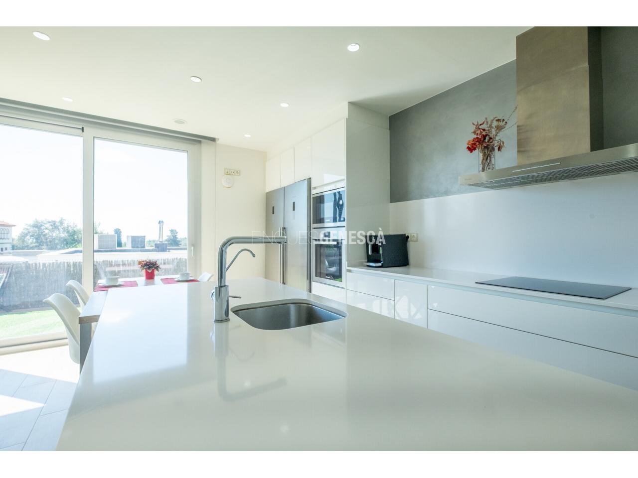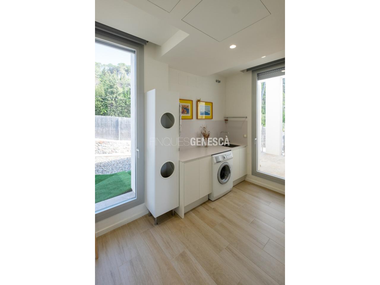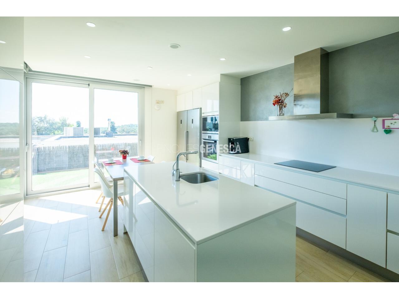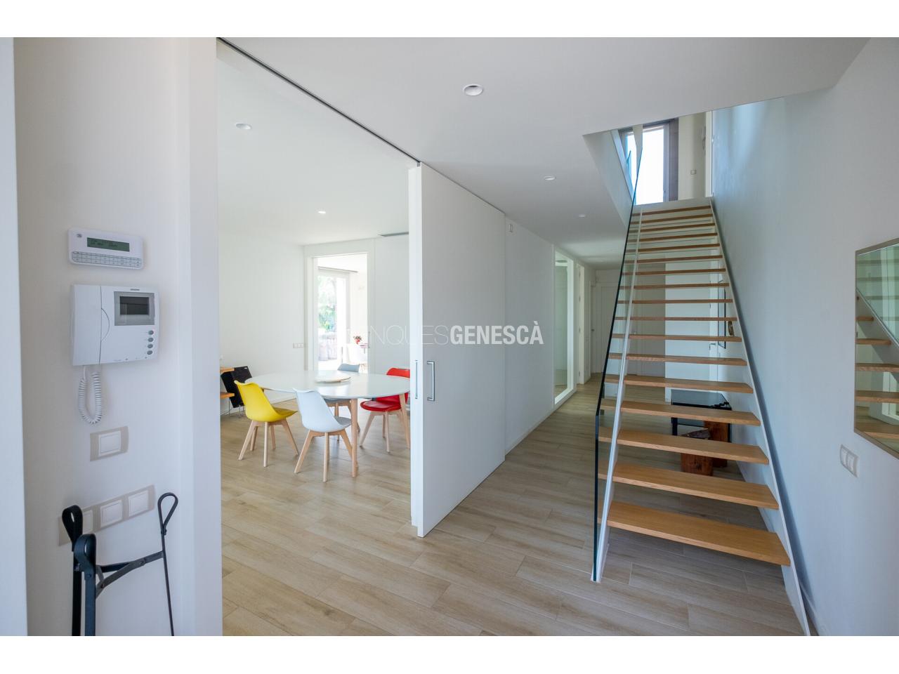A la planta baixa, s'accedeix a un elegant vestíbul amb una escala oberta que connecta amb la planta superior. Des d'aquí, trobem un saló-menjador lluminós amb grans finestrals i accés directe al jardí. La cuina està equipada amb electrodomèstics Bosch, que inclou frigorífic, congelador, forn, microones, rentavaixelles i placa d'inducció. El mobiliari, de disseny nòrdi i acabat lacat en blanc, inclou una gran illa central, combinant funcionalitat i estètica.Completen aquesta planta un bany adaptat i un dormitori que pot funcionar com a despatx de 18 m².
