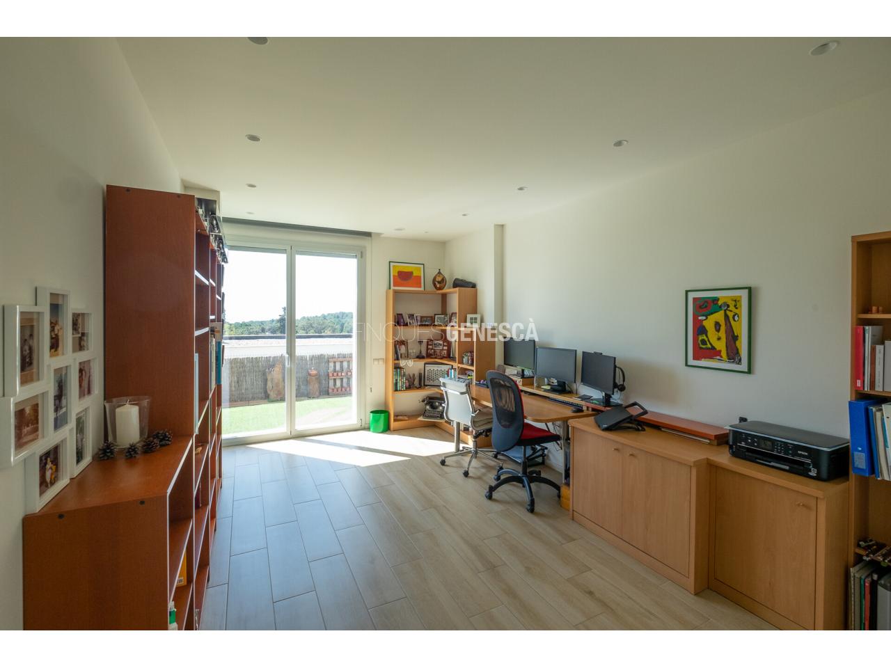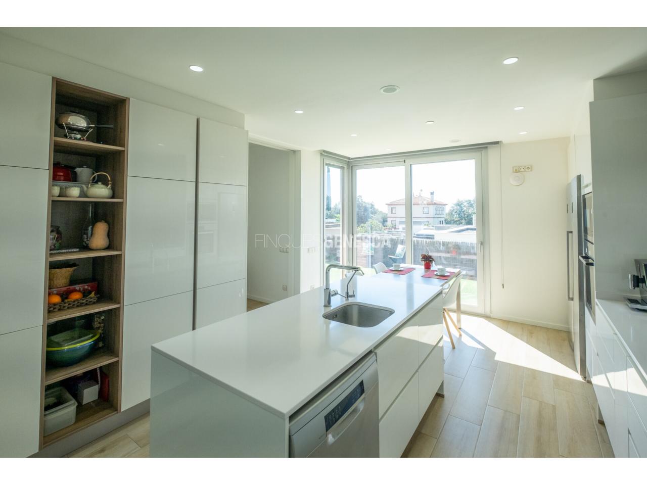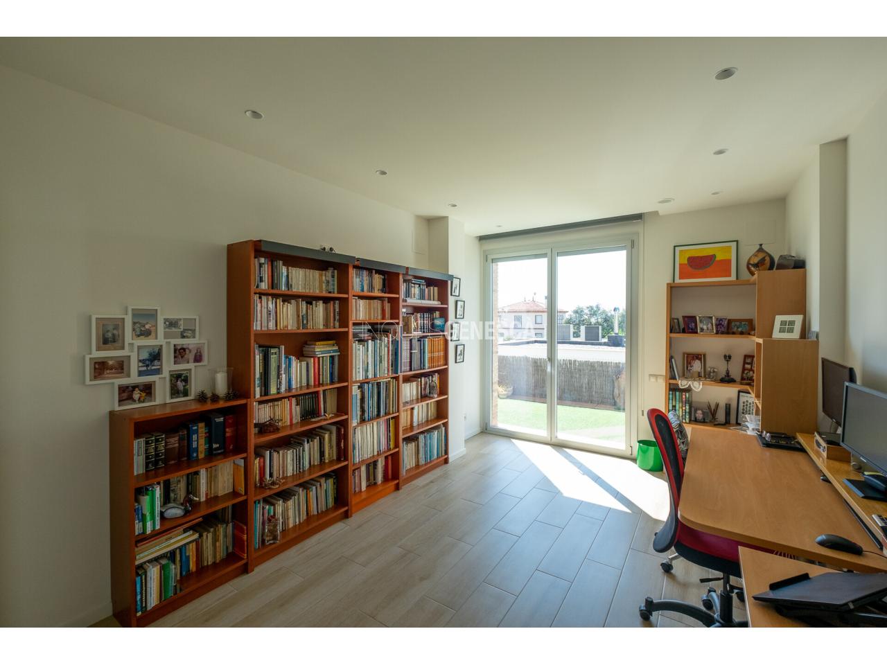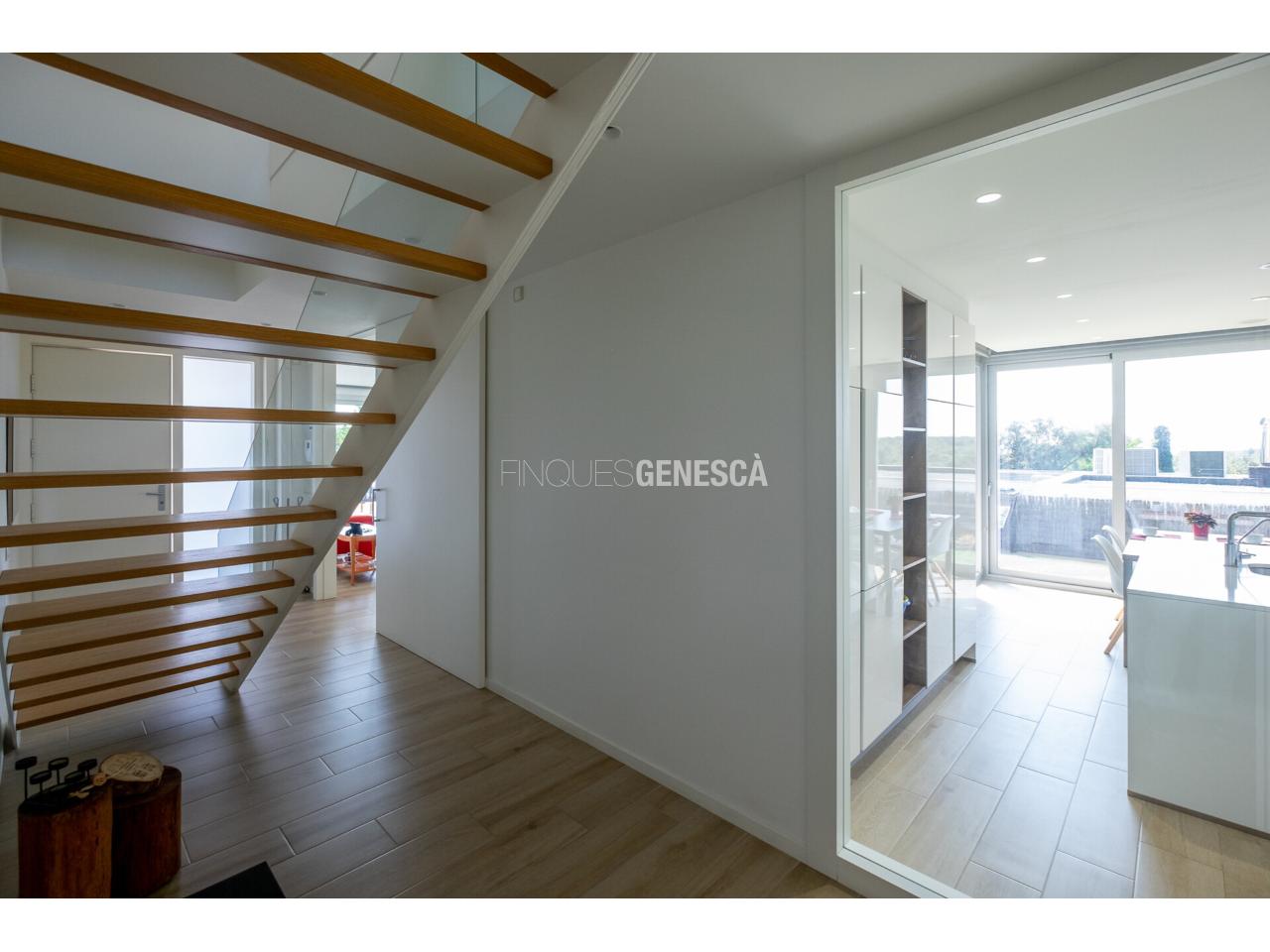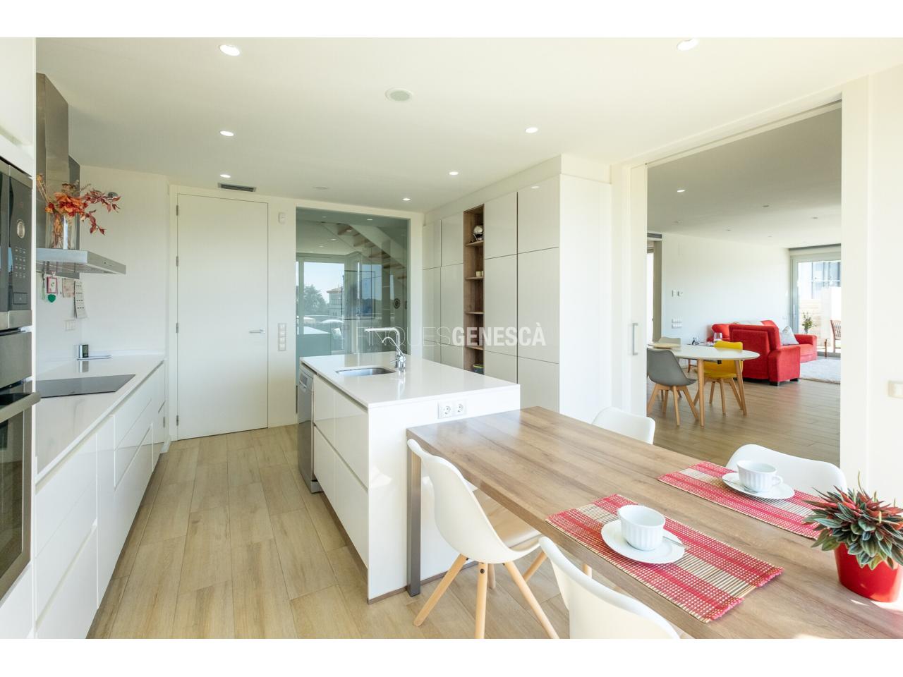 A la planta baixa, s'accedeix a un elegant vestíbul amb una escala oberta que connecta amb la planta superior. Des d'aquí, trobem un saló-menjador lluminós amb grans finestrals i accés directe al jardí. La cuina està equipada amb electrodomèstics Bosch, que inclou frigorífic, congelador, forn, microones, rentavaixelles i placa d'inducció. El mobiliari, de disseny nòrdi i acabat lacat en blanc, inclou una gran illa central, combinant funcionalitat i estètica.Completen aquesta planta un bany adaptat i un dormitori que pot funcionar com a despatx de 18 m².