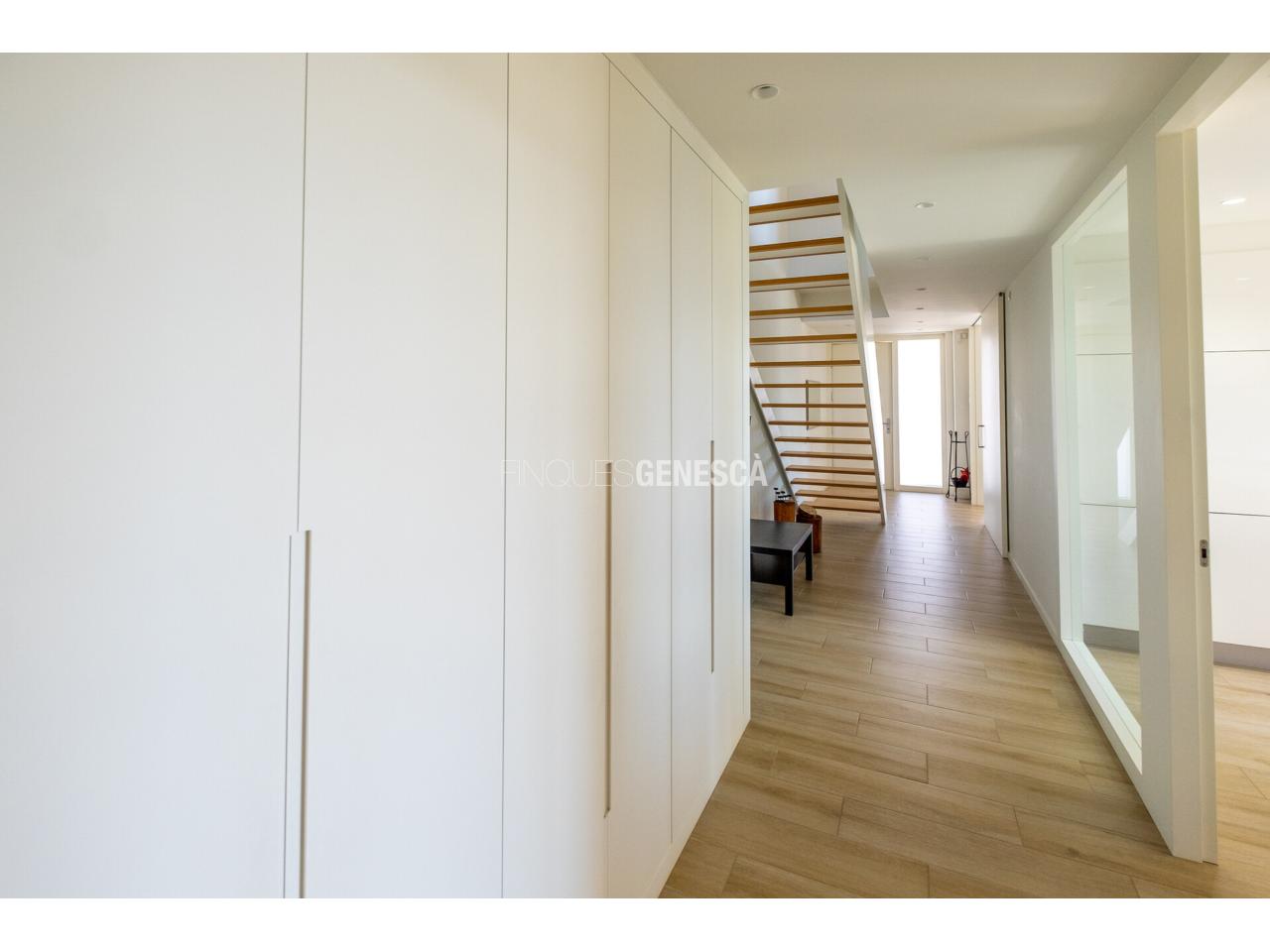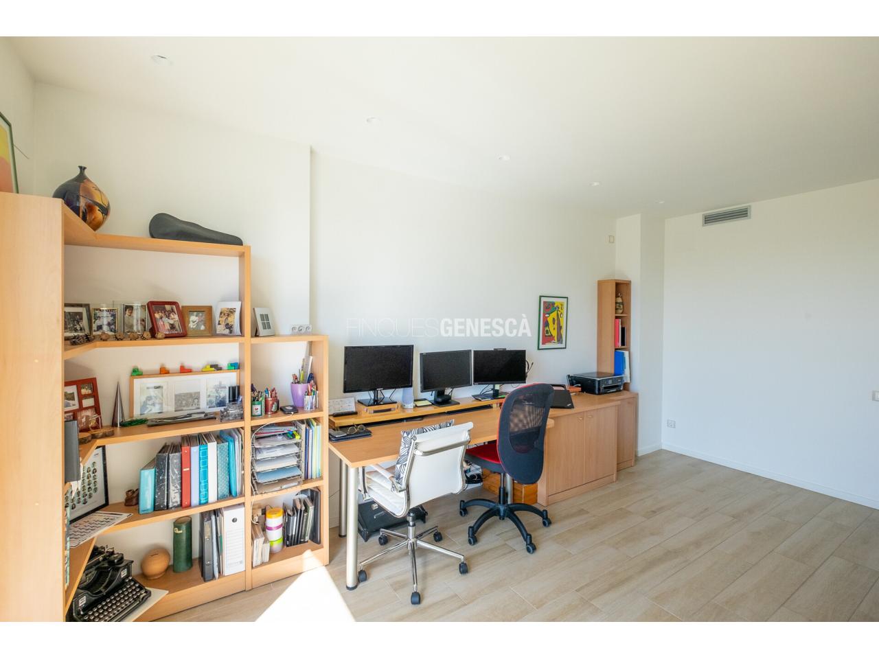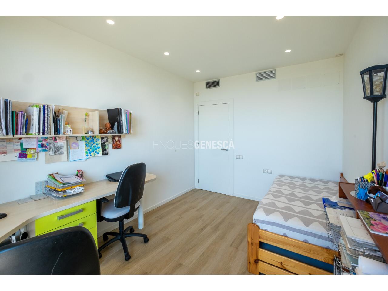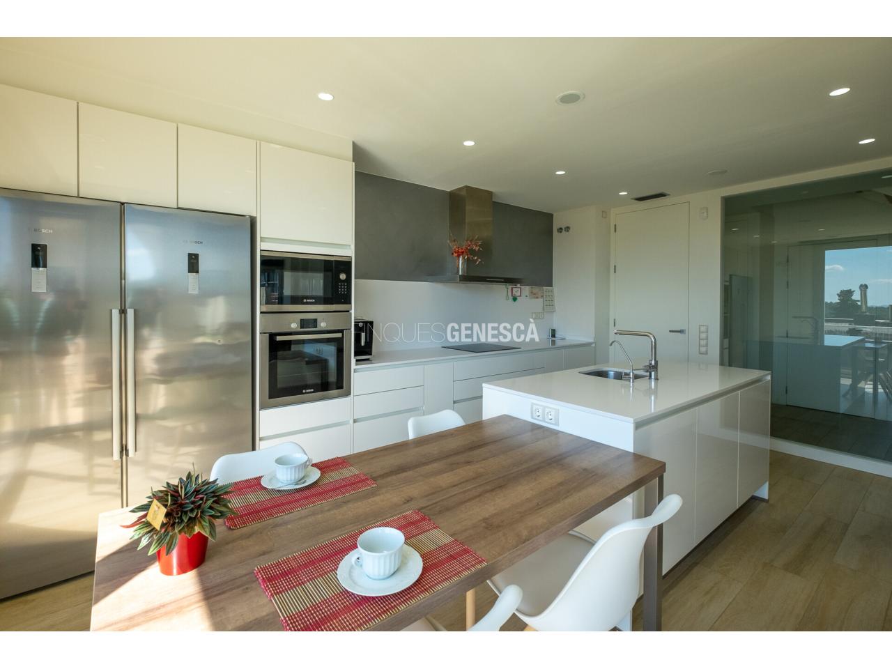 A la planta baixa, s'accedeix a un elegant vestíbul amb una escala oberta que connecta amb la planta superior. Des d'aquí, trobem un saló-menjador lluminós amb grans finestrals i accés directe al jardí. La cuina està equipada amb electrodomèstics Bosch, que inclou frigorífic, congelador, forn, microones, rentavaixelles i placa d'inducció. El mobiliari, de disseny nòrdi i acabat lacat en blanc, inclou una gran illa central, combinant funcionalitat i estètica.Completen aquesta planta un bany adaptat i un dormitori que pot funcionar com a despatx de 18 m².