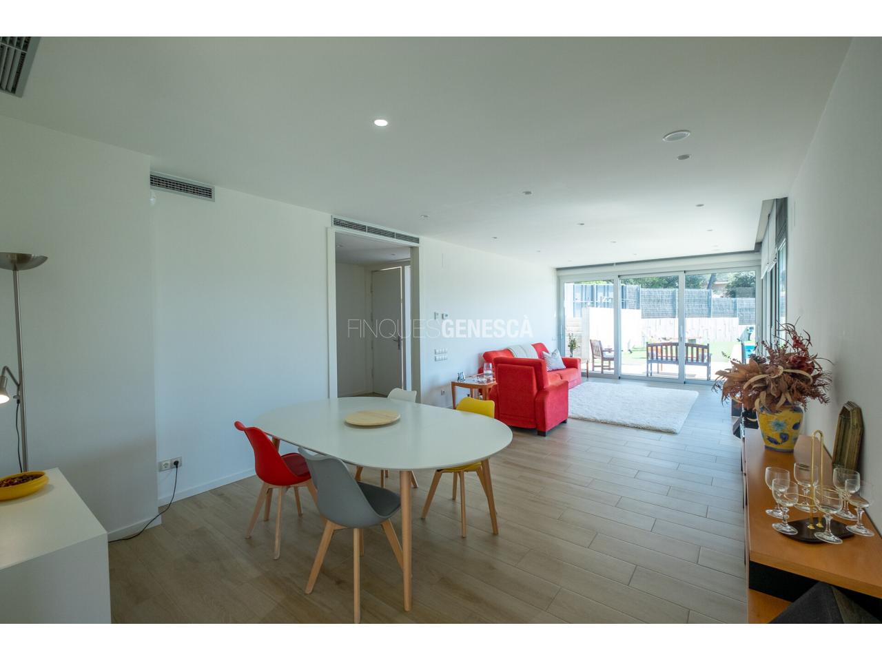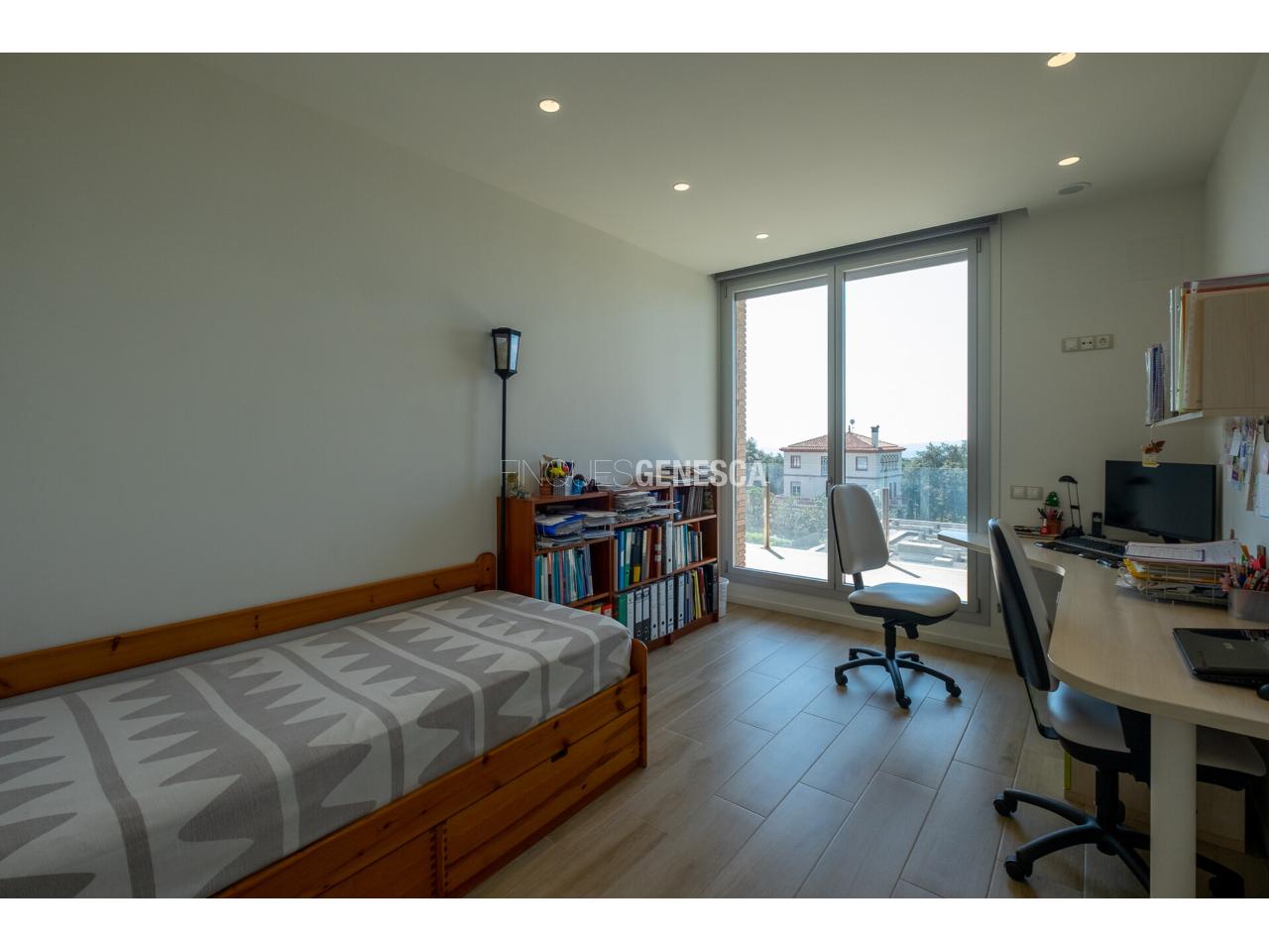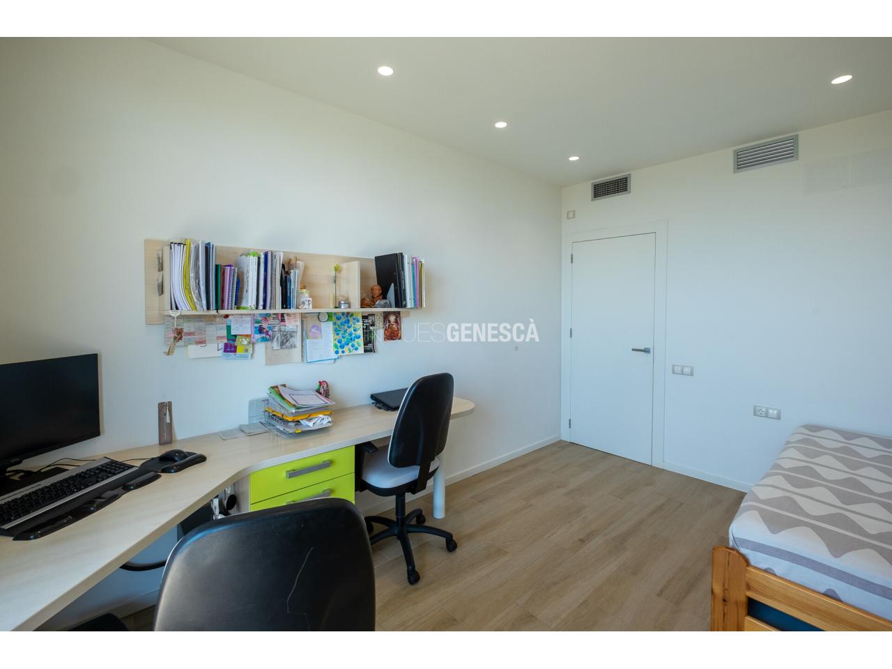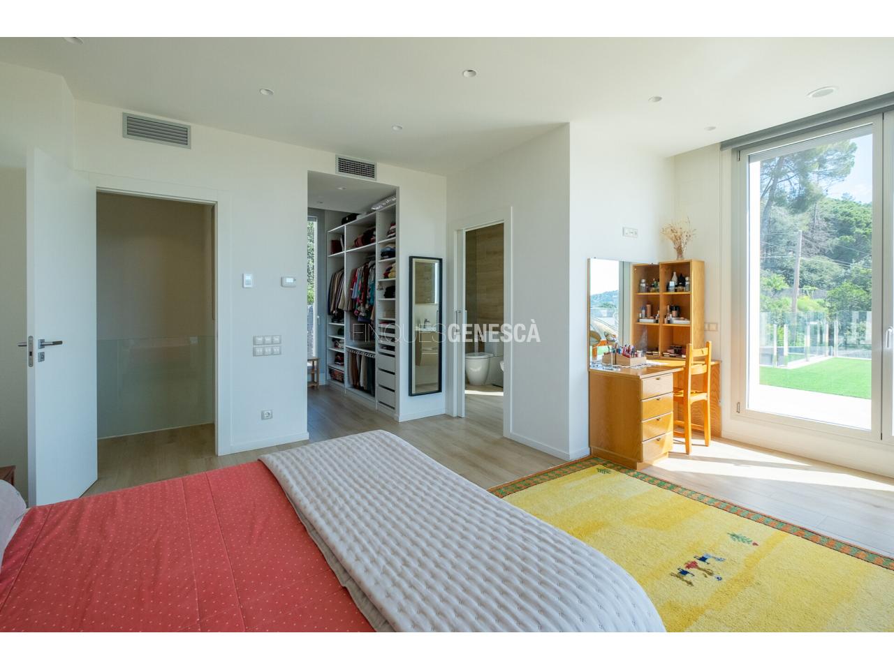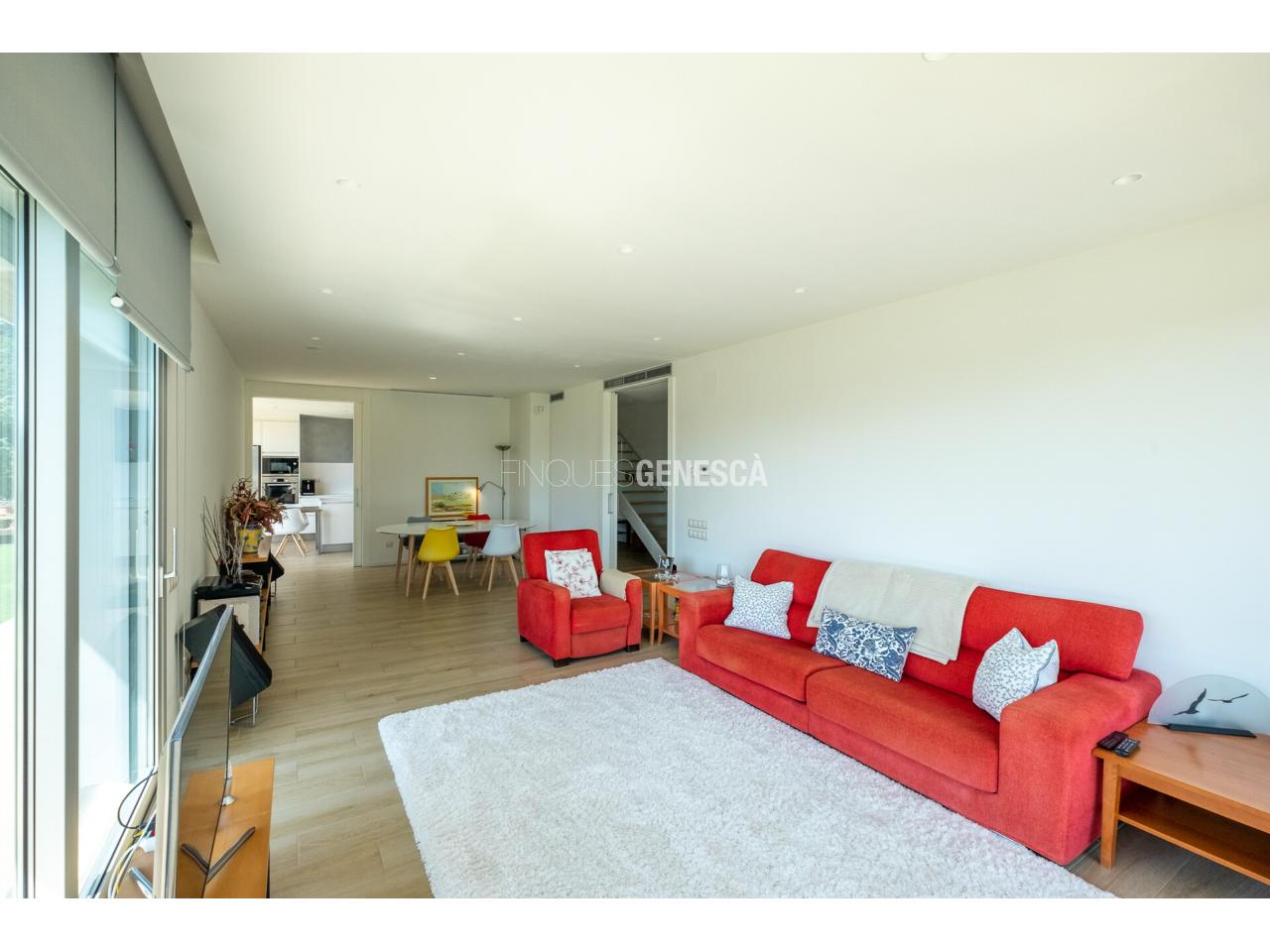 A la planta baixa, s'accedeix a un elegant vestíbul amb una escala oberta que connecta amb la planta superior. Des d'aquí, trobem un saló-menjador lluminós amb grans finestrals i accés directe al jardí. La cuina està equipada amb electrodomèstics Bosch, que inclou frigorífic, congelador, forn, microones, rentavaixelles i placa d'inducció. El mobiliari, de disseny nòrdi i acabat lacat en blanc, inclou una gran illa central, combinant funcionalitat i estètica.Completen aquesta planta un bany adaptat i un dormitori que pot funcionar com a despatx de 18 m².