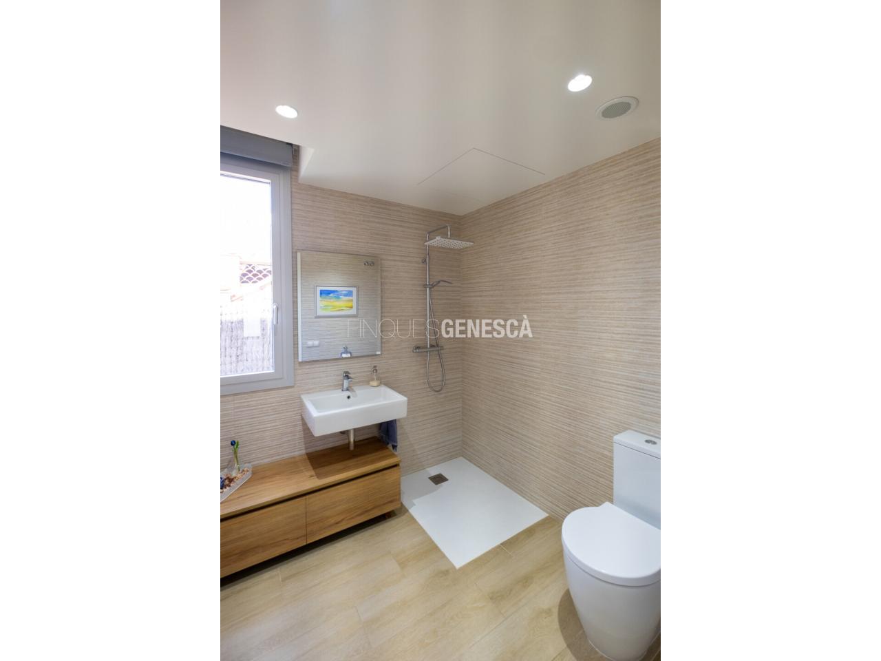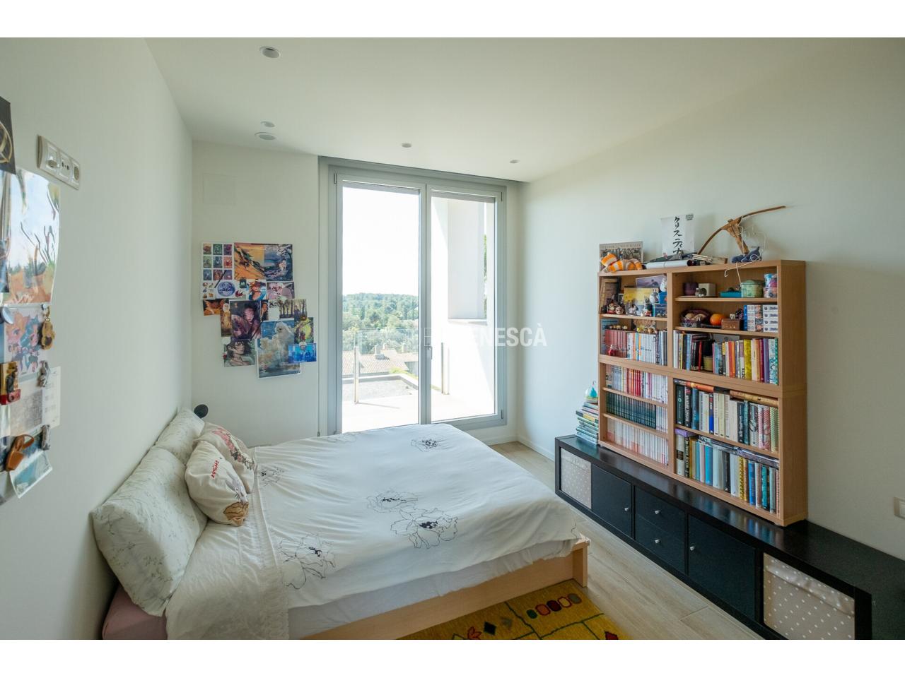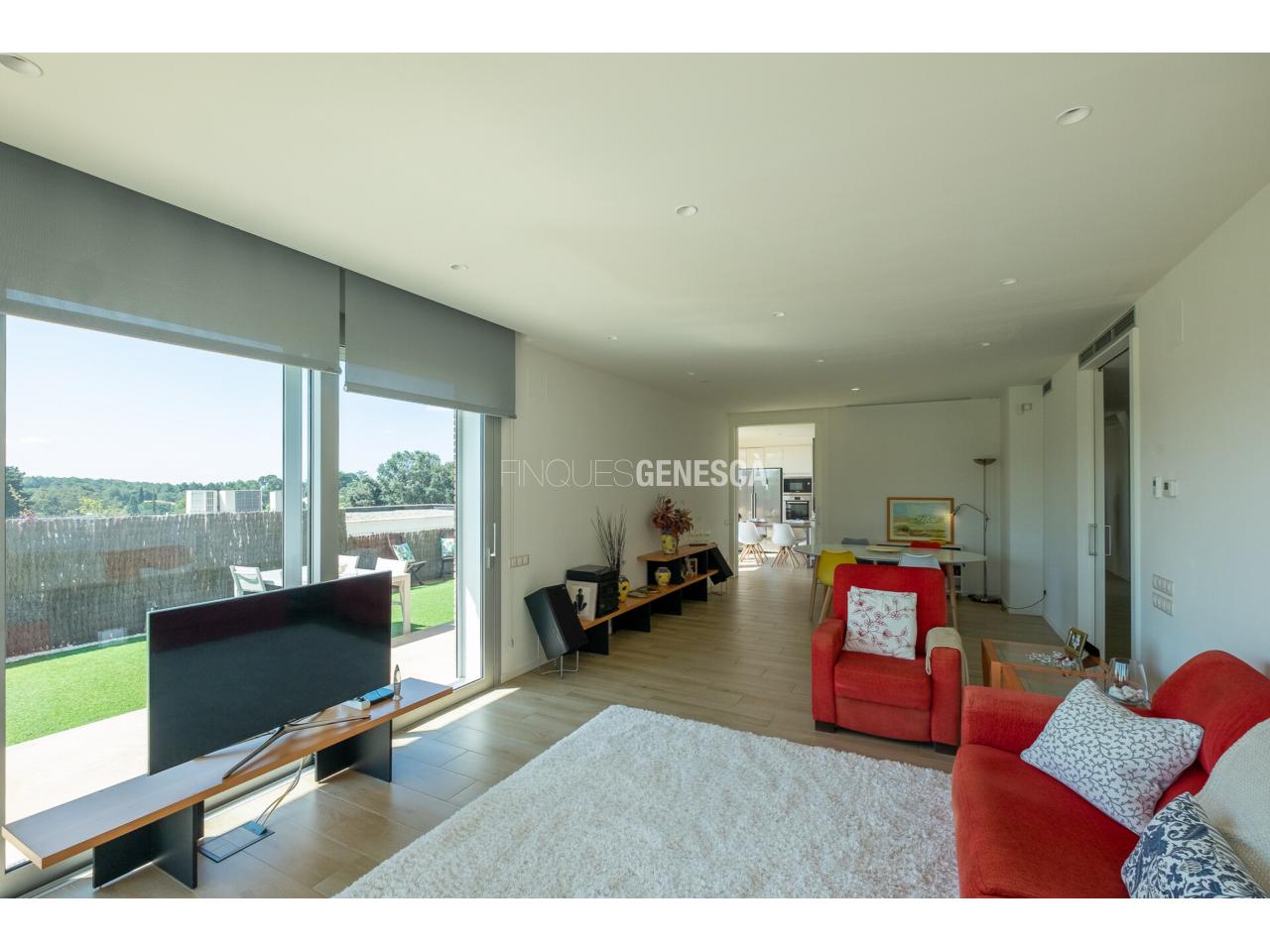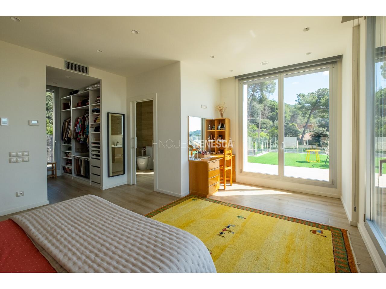 A la planta baixa, s'accedeix a un elegant vestíbul amb una escala oberta que connecta amb la planta superior. Des d'aquí, trobem un saló-menjador lluminós amb grans finestrals i accés directe al jardí. La cuina està equipada amb electrodomèstics Bosch, que inclou frigorífic, congelador, forn, microones, rentavaixelles i placa d'inducció. El mobiliari, de disseny nòrdi i acabat lacat en blanc, inclou una gran illa central, combinant funcionalitat i estètica.Completen aquesta planta un bany adaptat i un dormitori que pot funcionar com a despatx de 18 m².