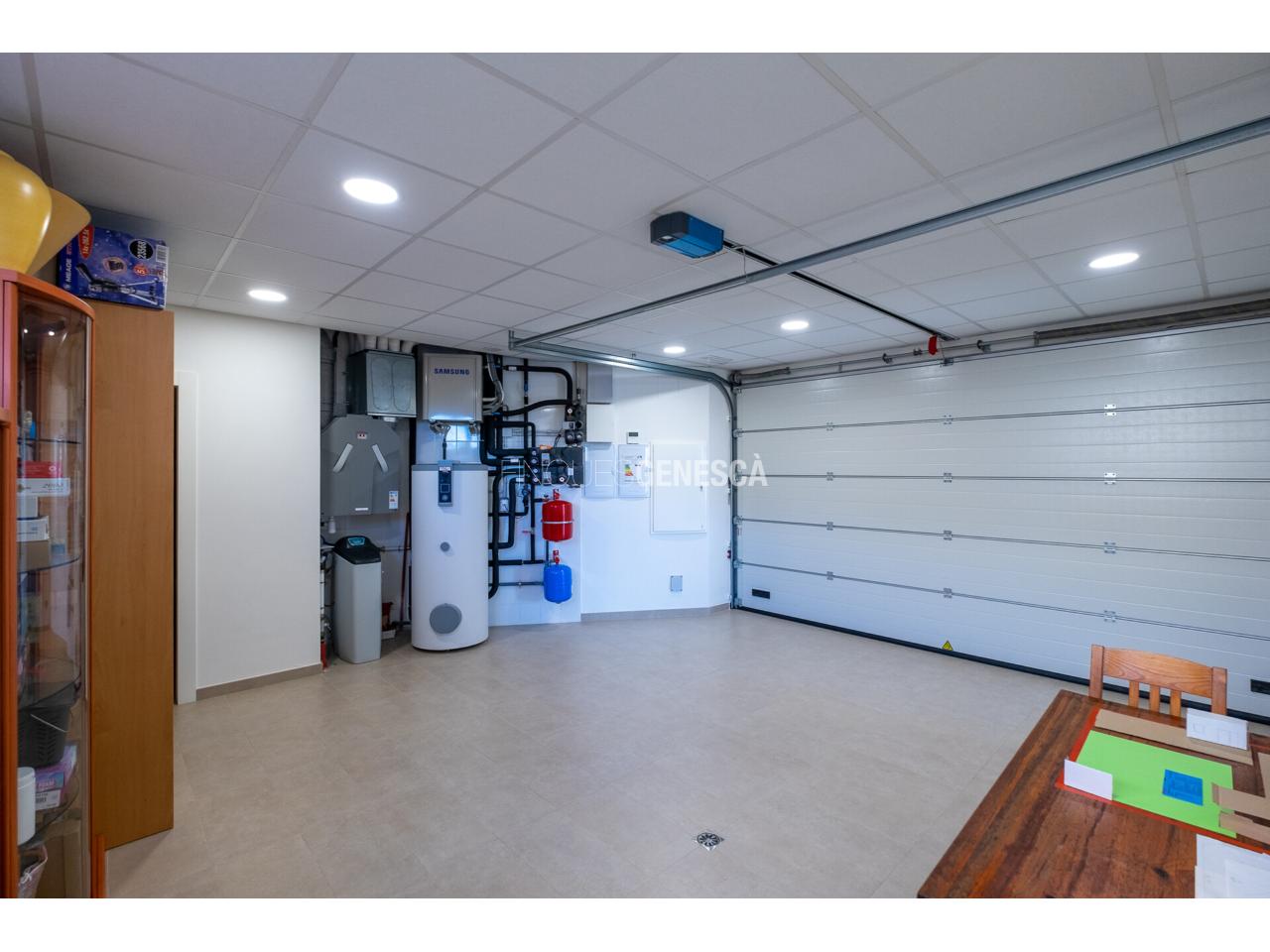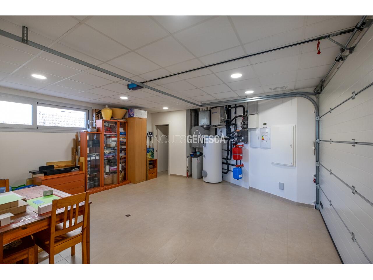 El garatge, amb una superfície de 32 m², compta amb espai per a dos vehicles, zona de màquines i un pràctic magatzem-despensa de 4 m².