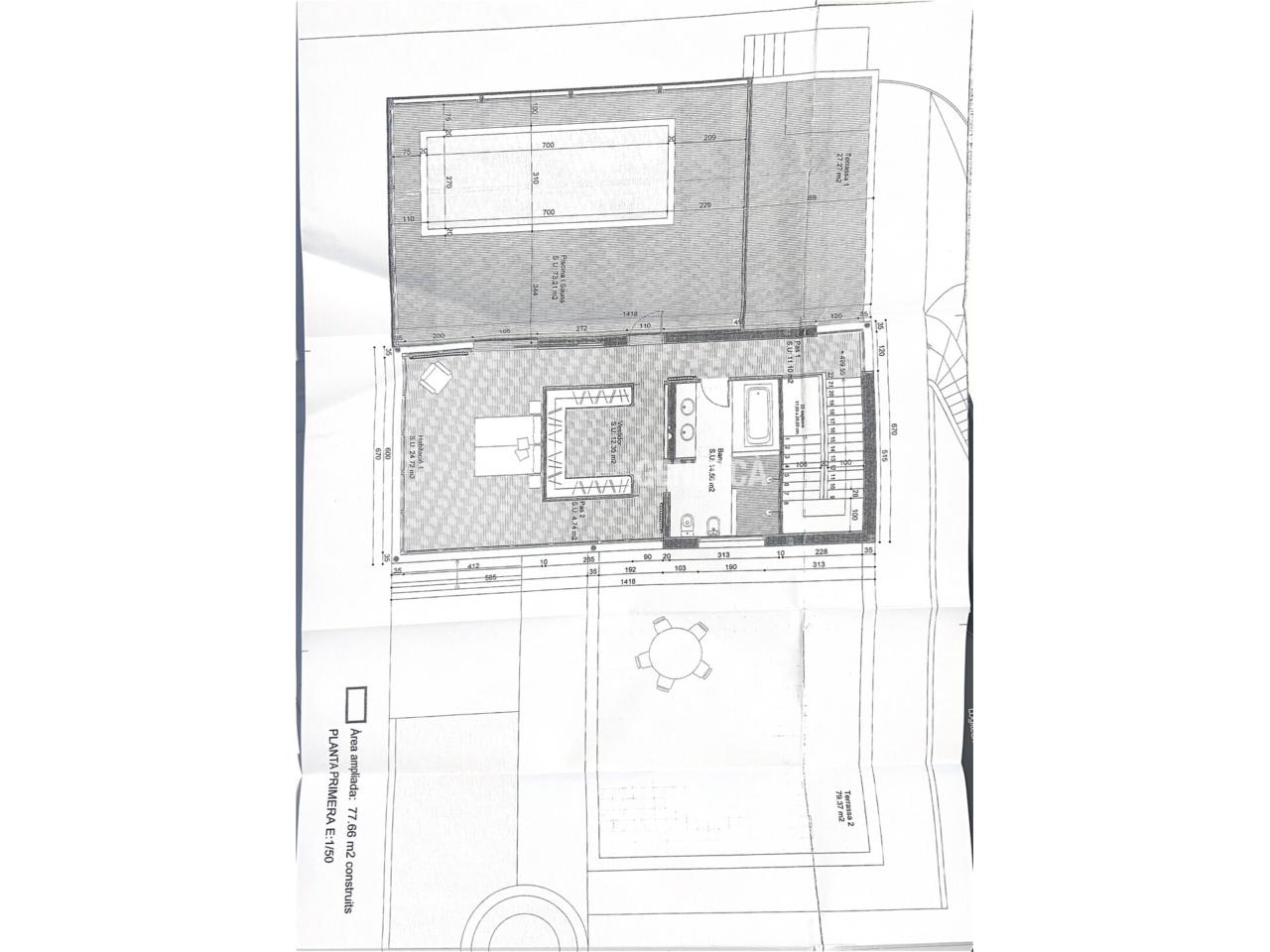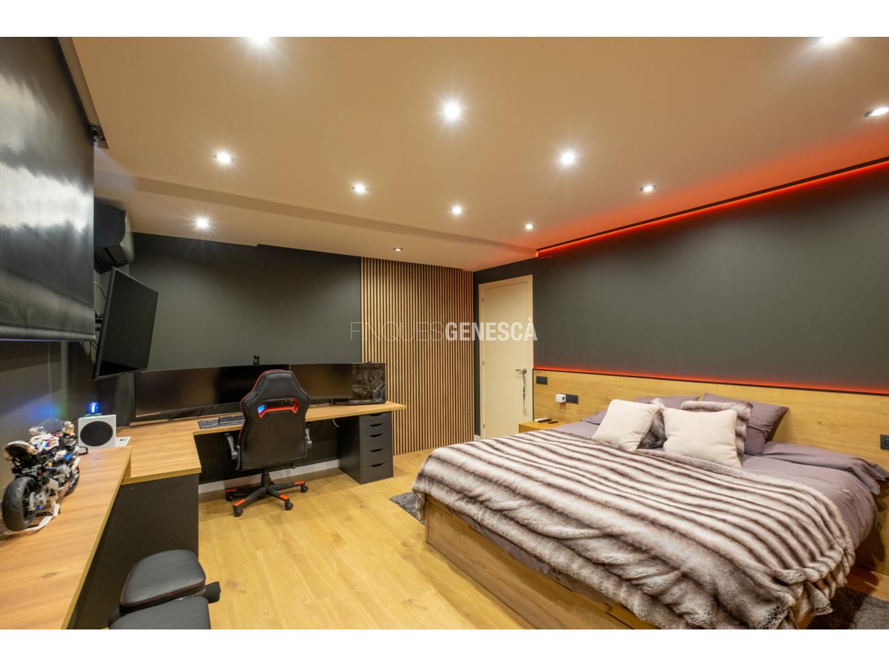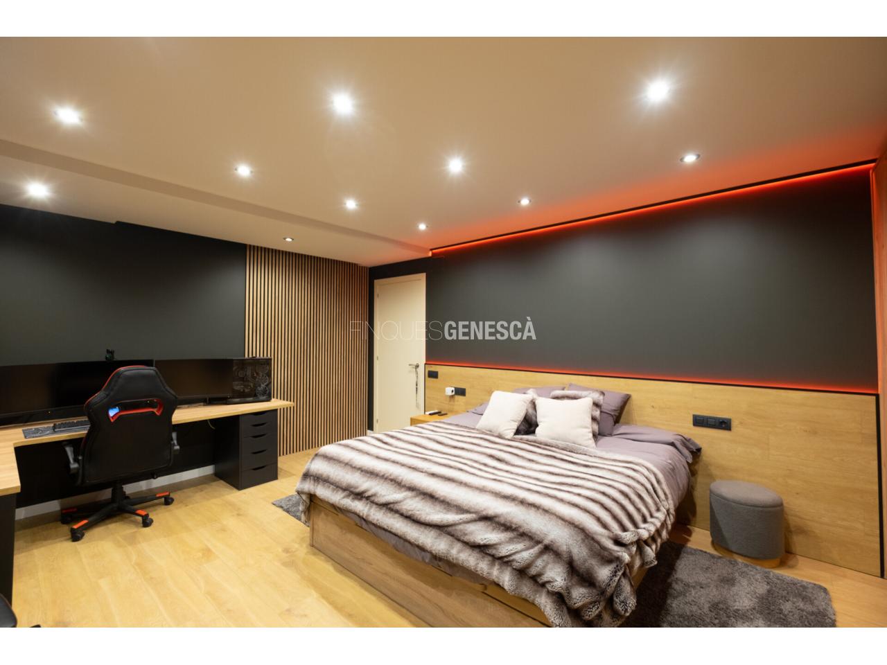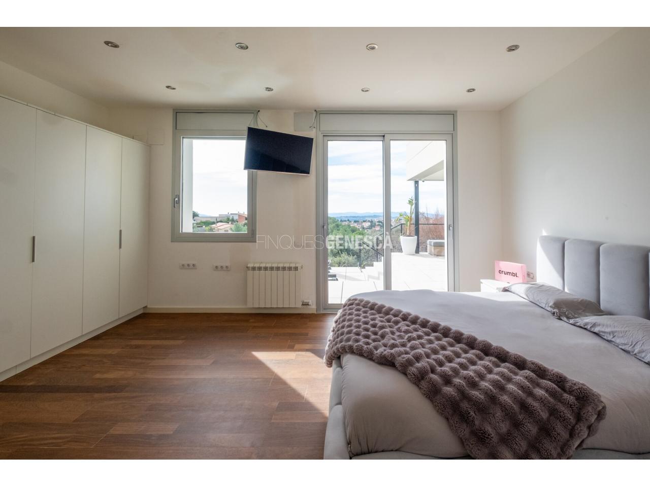 A la planta superior s’hi accedeix per una escala àmplia i elegant que condueix a una zona privada tipus suite, amb vestidor i sortida a una espectacular terrassa de 60 m², amb possibilitat d’ampliació si es desitja. Tot plegat amb orientació sud i vistes obertes al poble i amb un total de 180m2