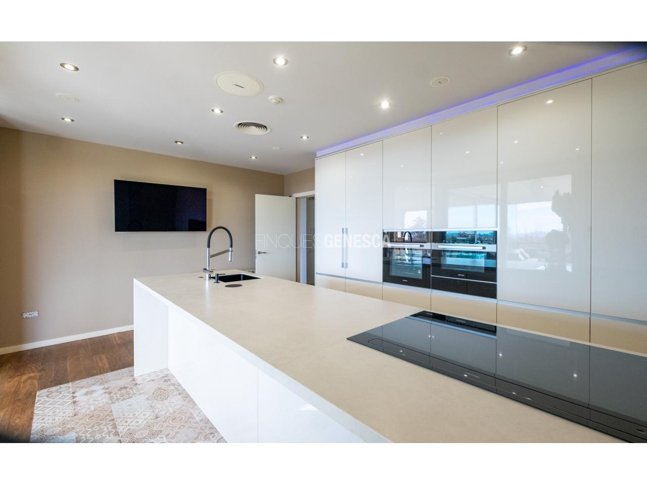 La zona de dia es compon d’un espectacular menjador de 60 m² connectat amb una cuina d’altíssima gamma de 22 m², equipada amb illa central i concebuda com a espai neuràlgic de la casa, tant funcional com representatiu. Els electrodomèstics són de la marca Miele, els components de la pica i les aixetes de Franke, i disposa d’una placa d’inducció de 120 cm —dimensions superiors a les habituals— amb campana integrada en el mateix sistema, aportant tecnologia, disseny i màxima eficiència.